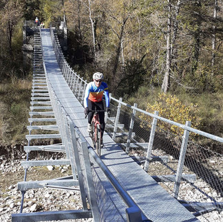La passerelle himalayenne que nous avons empruntée les uns après les autres afin de ne pas la mettre en vibration (?). Puis le tunnel non éclairé qui prolonge cette passerelle. Heureusement, l’organisateur était équipé d’une puissante lampe (achetée à prix d’or au Coin du Vélo…) qui a permis de progresser en toute sécurité...